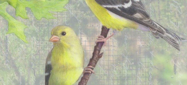 We love the feisty American Goldfinches at our winter feeders. They’re acrobatic, noisy, and occasionally fierce. By the middle of May, the males will sport banana yellow breeding plumage. That color was a challenge to capture in colored pencil. This pair is at home along Indiana roadsides–a habitat with a lot of history.